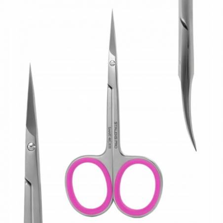 Profesjonalne nożyczki Staleks PRO Smart 40 SS-40/3 są przeznaczone do pracy z naskórkiem. Nożyczki mają wygiętą formę ostrzy, aby ułatwić pracę w zatokach. Taka forma ostrzy powtarza kształt łuków, zapewnia większą widoczność i ułatwia pracę w trudno dostępnych miejscach. Podobnie jak cały zestaw narzędzi Staleks PRO, nożyczki Smart 40 są wykonane z wysokiej jakości stali, ręcznie naostrzone i wypolerowane pastą GOI w celu zwiększenia odporności na korozję.