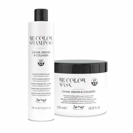 Be Color Maska do włosów farbowanych i traktowanych chemicznie, z kawiorem, keratyną i kolagenem, posiada specjalną formułę bogatą w składniki odżywcze, nawilżające i przeciwutleniacze, rozplątuje i zmiękcza włosy farbowane poddawane częstym zabiegom chemicznym. Zapewnia witalność, niewiarygodny połysk i jedwabistą miękkość. Przedłuża trwałość koloru chroniąc go przed czynnikami chemicznymi i środowiskowymi.
