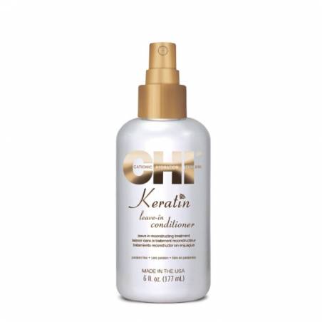 CHI Keratin Keratynowy spray to lekka odżywka bez spłukiwania o właściwościach silnie regenerujących i nawilżających.Zawartość naturalnego białka keratynowego sprawia, że uszkodzone partie włosa zostają odbudowane i wypełnione, co wzmacnia jego wytrzymałość i odporność na uszkodzenia. Szlachetne olejki - arganowy i jojoba - mają silne działanie odżywcze i nawilżające, uelastyczniają włókna włosów, przeciwdziałając łamliwości i kruchości. Odżywka gwarantuje efekt idealnie lśniących, gładkich i zdrowych włosów - natychmiast po użyciu.