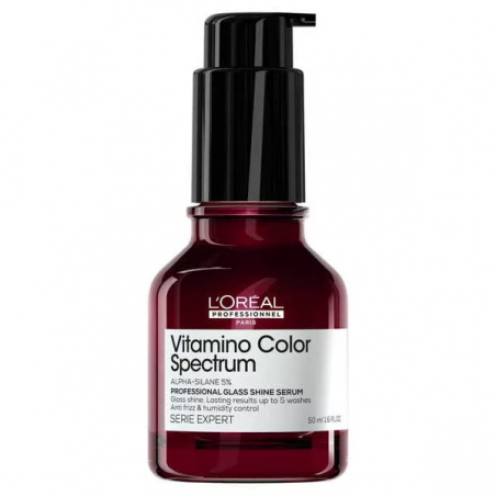 L'Oréal Professionnelserum Vitamino Color Spectrum bez spłukiwania do włosów farbowanych z gamy zapewnia natychmiastowy połysk z efektem tafli i długotrwałe rezultaty aż do 5 myć***. Chroni włosy przed puszeniem do 72 h**** i zabezpiecza je przy wilgotności powietrza do 80%. Jednocześnie chroni pasma przed wysoką temperaturą do 230ºC***** urządzeń do stylizacji.