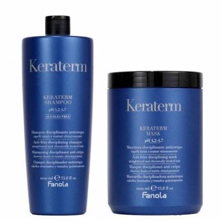 Zestaw z keratyną Fanola Keraterm to szampon i maska do pielęgnacji włosów prostowanych. Oba kosmetyki skutecznie utrwalają efekt zabiegu, zapobiegają puszeniu włosów i ułatwiają ich układanie.