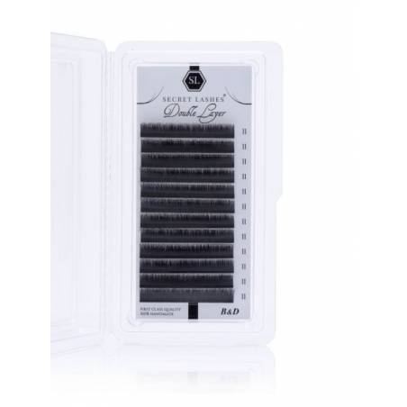 Double Layer to rzęsy o dwóch skrętach, które umieszczone są na jednym pasku. Daje to efekt wielowymiarowości i puszystości aplikacji. Mają kolor lekko połyskującej, intensywnej czerni. Grubość paska z klejem: 3mm.