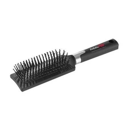 BaByliss PRO Płaska szczotka to przede wszystkim bardzo wygodne narzędzie do czesania. Świetna dla włosów długich i półdługich Szczotka posiada wysokiej jakości włosie, a także wyposażona jest w specjalną powłokę, która zabezpiecza włosy przed elektryzowaniem. Ponadto ta pneumatyczna szczotka posiada ergonomiczny kształt, który zapewnia wygodną pracę oraz brak obciążenia nadgarstka. Dzięki gumowanej rączce szczotka nie wysunie się nawet z mokrej dłoni. To wysokiej jakości narzędzie fryzjerskie doskonale sprawdzi się w każdym profesjonalnym salonie fryzjerskim lub w domowym użytku.